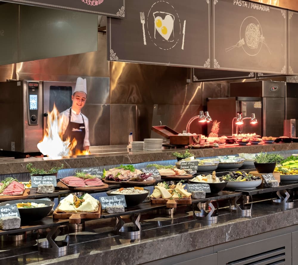 Açık büfe kahvaltı yetişkinler için yaklaşık olarak 27 EUR, çocuklar için 13.5 EUR ücret karşılığında servis edilmektedir Evcil hayvan ücreti